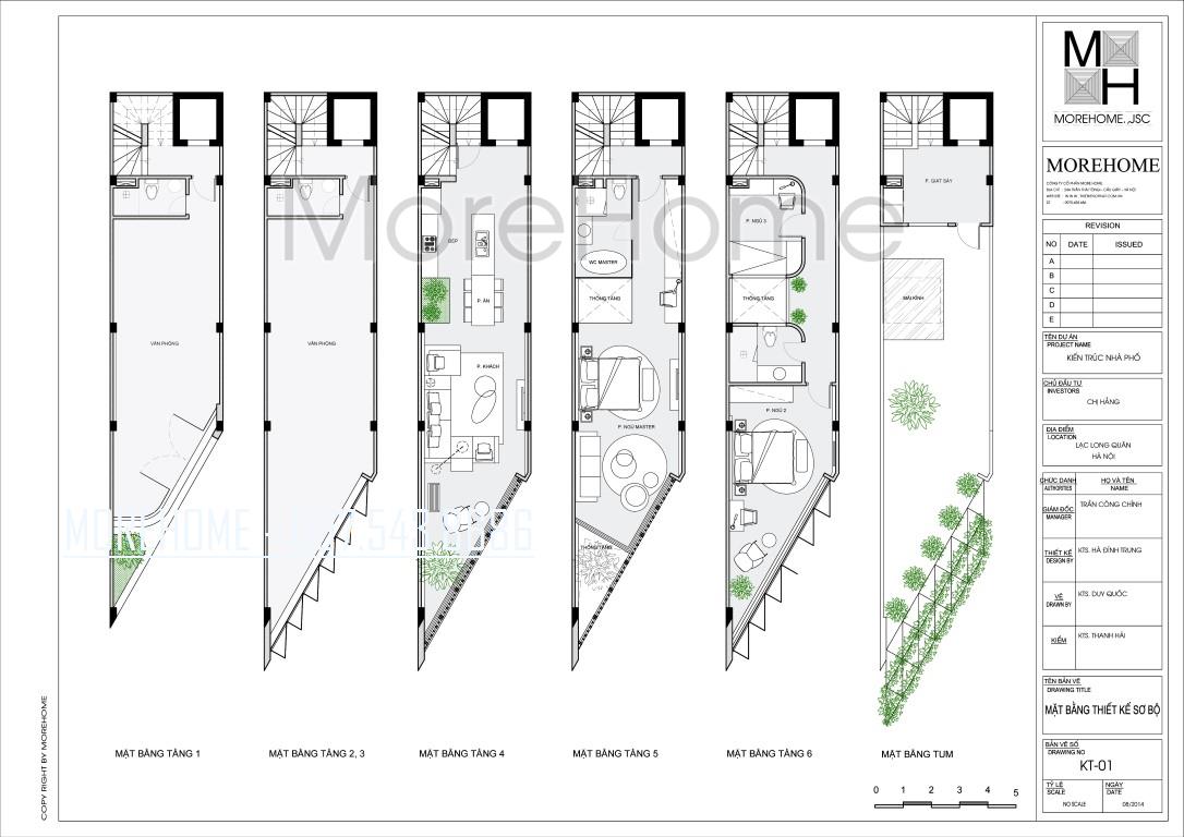 Tầng 1, tầng 2 và tầng 3 của ngôi nhà phố được thiết kế làm văn phòng cho thuê. Tầng 4 là tầng sinh hoạt của gia đình với kết cấu bao gồm: phòng khách, phòng ăn, tủ bếp, và ban công. Ở tầng 5 là bản vẽ thiết kế nội thất cho phòng ngủ master và phòng tắm master. Lên đến tầng 6 là 2 phòng ngủ và 1 nhà vệ sinh cùng khu vực ban công. Tầng tum trên cùng được thiết kế làm phòng giặt đồ và nơi trồng cây xanh của gia đình.